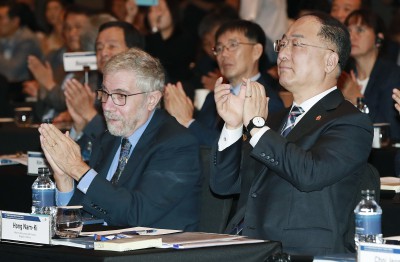 [사진] "반갑습니다" 악수 하는 홍남기 - 폴 크루그먼