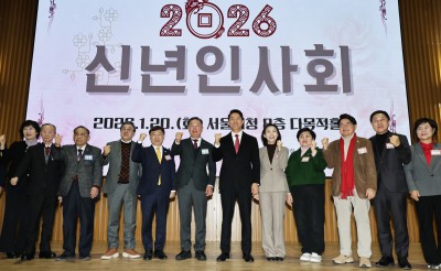 파이팅 외치며 기념촬영하는 '2026년 대한노인회 서울연합회 신년인사회' 참석자들