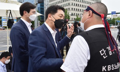 '언론중재법 개정안 반대' 국회 앞 1인 시위 나선 허성권 노조위원장