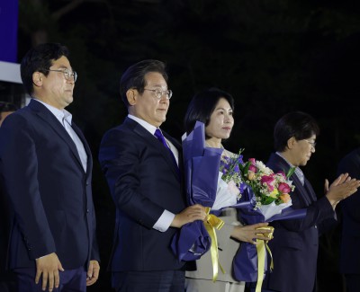 '당선 확실' 손 들어올린 이재명 더불어민주당 대선 후보