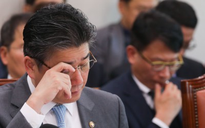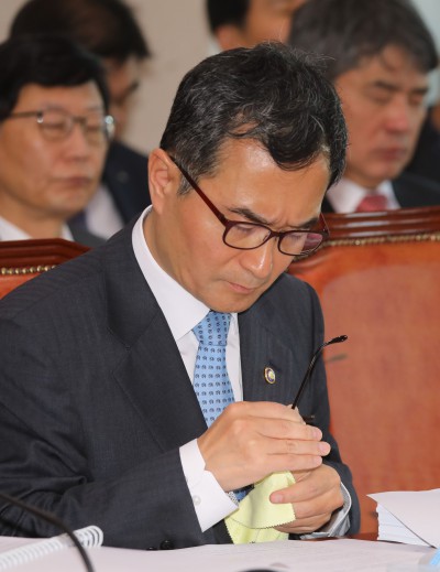[사진] 안경 고쳐쓰는 유명희 산업통상자원부 통상교섭본부장