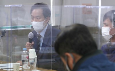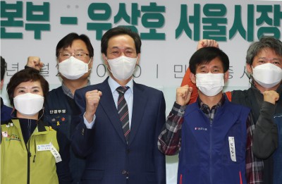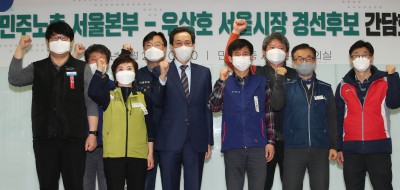 간담회 앞서 기념촬영하는 우상호 예비후보-민주노총 서울지역본부