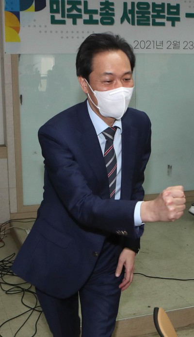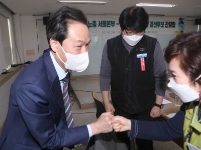 정운교 공공운수노조 서울본부장과 인사 나누는 우상호 예비후보