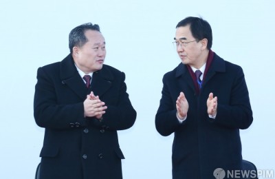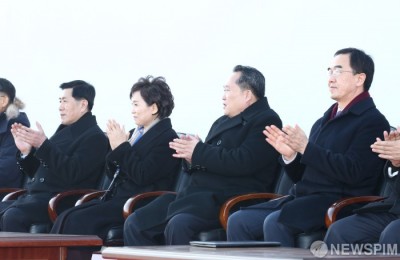 [사진] 남북 철도·도로 연결 및 현대화 착공식, 박수 치는 조명균·리선권