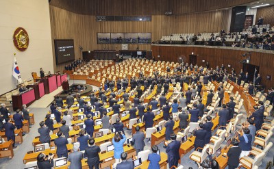 이재명 대통령 맞이하는 민주당 의원들과 텅 빈 국민의힘 의석
