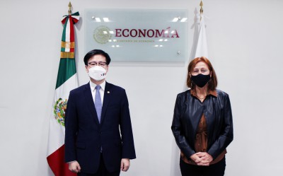 루이스 에브라르드 카사우본 멕시코 경제부 장관 맞이하는 이재명 대통령