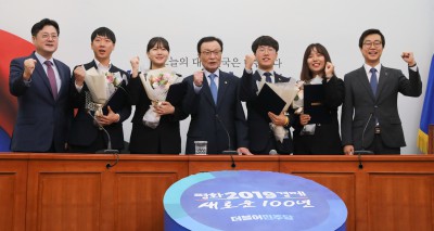 더불어민주당 청년대변인 발언 경청하는 전다현-임지혜 공동의장