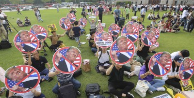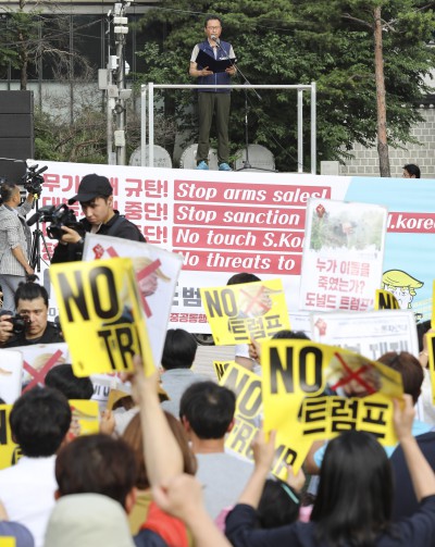 [사진] 구호 외치는 김명환 위원장, "NO 트럼프!"