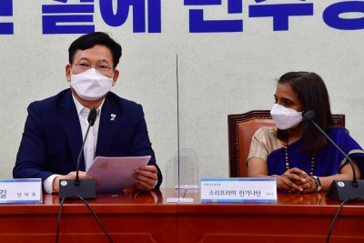 스리프리야 란가나탄 주한인도대사에게 인사말하는 송영길 대표