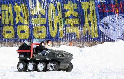 눈밭에서 스릴넘치는 아르고를 즐기는 '평창송어축제' 찾은 방문객들