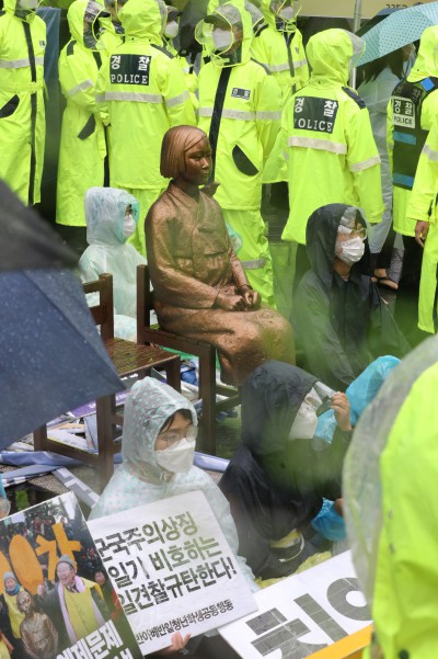 쏟아지는 빗속에서 소녀상 지키는 반아베반일청년학생공동행동