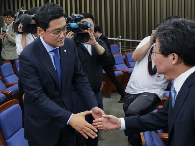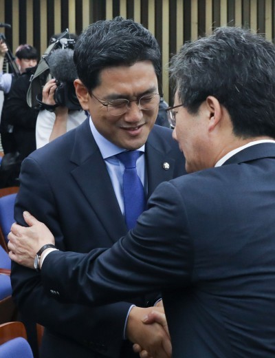 [사진] '감사합니다-고생했어요' 악수 나누는 오신환 신임 원내대표-유승민 의원