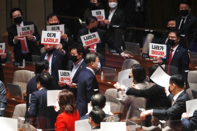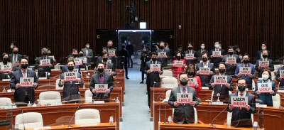 피켓 든 국민의힘 의원들 사이로 이동하는 문재인 대통령