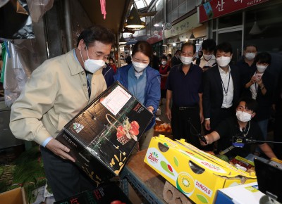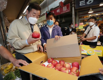 '사과가 잘 익었네요' 통인시장서 사과 보는 이낙연 당대표