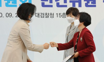 위촉장 수여 후 주먹인사하는 박영선 장관과 조현숙 민간위원