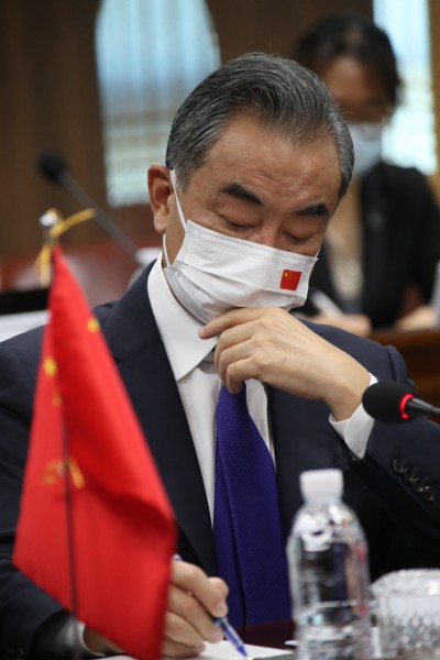 '시진핑 방한 반대 1인 시위' 열리는 가운데 들어서는 왕이 외교부장