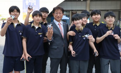 드론이 즐거운 여학생들과 기념촬영하는 박상우 국토교통부 장관