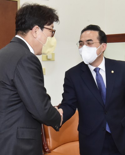 대화 나누는 박홍근 더불어민주당 - 권성동 국민의힘 원내대표
