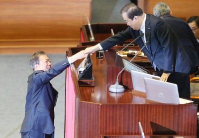 [사진] '고생하셨습니다' 악수 나누는 문재인 대통령-문희상 국회의장