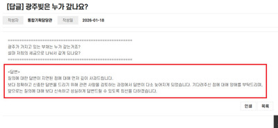 광주시 공무원 80.5% '행정통합' 부정적 인식 드러내 [광주=뉴스핌] 박진형 기자 = 광주시 공무원 절반 이상이 행정통합에 부정적인 인식을 드러냈다. 공무원노조 광주본부 광주시지부는 지난 16일부터 19일까지 4일간 전체 5급 이하 광주시 공무원 2585명을 대상으로 광주 전남 행정통합 직원 인식 조사를 실시했다고 20일 밝혔다. 광주전남 행정통합 직원 인식조사. [그래프=생성형 AI 그록(Grok)] 2026.01.20 bless4ya@newspim.com 해당 조사에는 958명이 참여했으며 응답자 중 58.7%(562명)가 행정통합에 매우 부정적, 21.9%(210명)는 다소 부정적이라고 답했다. 대다수에 해당하는 80.5%(772명)가 사실상 반대하고 있다는 수치다. 이어 보통 10%(96명), 긍정적 5.7%(55명), 매우 긍정적 3.7%(35명) 순으로 나타났다. 행정통합을 우려하는 이유로는 근무지 이동(889명, 92.7%)이 가장 많이 꼽혔다. 뒤이어 인사 보수 체계(568명, 59%), 조직 개편(495명, 51.6%), 고용 안정성(257명, 26.8%), 직무 변경(227명, 23.6%) 등 순서를 보였다. 내부 직원과 노조 의견이 충분히 반영됐는지 묻는 질문에는 65.3%(626명)이 '전혀 아니다', 21.1%(202명)은 그렇지 않다고 선택했다. 시도특별법 추진 과정에서 가장 중요하다고 생각하는 가치로는 공정한 인사(329명, 34.3%), 고용 안정(239명, 24.9%), 지역 균형 발전(182명, 19%), 근로조건 개선(130명, 13.6%), 조직 효율성(79명, 8.2%)로 조사됐다. 한 공무원은 조사에서 "너무 급하게 추진하는 느낌이다. 백년대계인 만큼 충분한 시간을 두고 검토해야 한다"고 비판했다. 또 다른 공무원은 조건부 찬성 입장을 밝히면서 "인사이동 발생 시 확실한 금전적 보사아과 주거 지원 대책이 선행돼야 한다"고 말했다. bless4ya@newspim.com 26-01-20 17:37