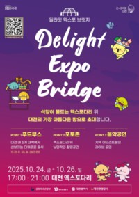"야경 보며 와인 한잔"...대전관광공사, '딜라잇 엑스포 브릿지' [대전=뉴스핌] 오영균 기자 = 대전관광공사는 오는 24일부터 26일까지 오후 5시부터 9시까지 엑스포다리 위에서 야간관광 특화도시 조성사업의 일환으로 '딜라잇 엑스포 브릿지' 행사를 개최한다고 밝혔다. 이번 행사는 '2025 대전국제와인 EXPO'와 연계해 대전의 대표 석양명소인 엑스포다리 위에서 와인과 함께 낭만적인 야경과 음악, 푸드를 방문객 누구나 즐길 수 있는 야간 체험 콘텐츠이다. 딜라잇 엑스포 브릿지 홍보 포스터. [사진=대전관광공사] 2025.10.23 gyun507@newspim.com 행사장에는 포토존과 조명, 가드닝을 활용한 테이블존 등 야간관광 특화공간이 조성돼 방문객 누구나 야경과 함께 인생사진을 남길 수 있다. 매일 오후 6시부터 8시까지 정각마다 재즈, 어쿠스틱, 팝페라 등 다양한 장르의 지역 아티스트 공연이 진행된다. 특히 25(토), 26일(일) 양일간 지역 5개 대학(우송대, 배재대, 목원대, 대전보건대, 대덕대)의 외식조리학과 학생들이 직접 참여하는 푸드부스를 운영하며 청년셰프들의 창의적인 메뉴를 선보일 예정이다. 또 현장에서는 야간관광 설문조사 이벤트에 참여하면 푸드부스 할인쿠폰을 제공하고, SNS 사전이벤트 참여시에는 추첨을 통해 경품도 증정한다. 대전관광공사 김용원 사장직무대행은 "대전의 대표 야간명소에서 지역 청년 인재들의 참여로 펼쳐지는 이번 행사가 대전의 밤을 한층 더 빛낼 것으로 기대한다"고 말했다. '딜라잇 엑스포 브릿지'의 자세한 내용은 포스터의 QR 코드를 통해 확인할 수 있다. gyun507@newspim.com 25-10-23 09:34