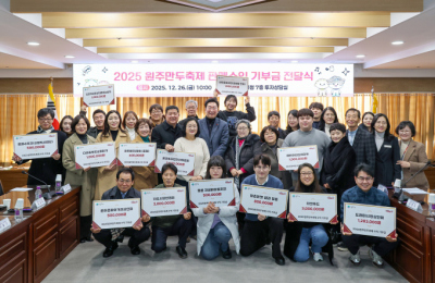 원주만두축제 판매수익 지역사회 기부 [원주=뉴스핌] 이형섭 기자 = 2025 원주만두축제 판매수익 기부금 전달식이 지난 26일 원주시청 7층 투자상담실에서 열려, 축제에서 발생한 판매수익 일부가 지역사회에 환원됐다. 이날 행사에는 총 13개 업체와 단체가 참여해 1618만 3000원의 기부금을 마련했다.​ 28일 원쥐에 따르면 이번 기부에는 자유시장번영회(200만 원), 도래미시장상인회(128만 3000원), 원주문화의거리상인회(50만 원), 중앙동주민자치위원회(250만 원) 등 전통시장과 지역 단체들이 참여해 축제의 상생 의미를 더했다. 원주만두축제 판매수익, 1618만 원 지역사회에 기부.[사진=원주시] 2025.12.28 onemoregive@newspim.com 또 ㈜다라온푸드 원미가(100만 원), 단디잇 밥상차려주는남자(100만 원), 로컬수랏간(50만 원), 만두뱅크(60만 원), 예진이네김치만두(100만 원), 명륜지코바숯불치킨(50만 원), 차칸푸드(300만 원) 등 축제 참여 업체들도 자발적으로 기부에 동참했다.​ 아우름봉사단(150만 원)과 청춘마켓(80만 원) 등 축제 운영과 프로그램에 참여한 단체들 역시 뜻을 모아 나눔에 함께했다. 모금된 기부금은 사회복지법인 포도마을재단 등 지역 복지기관에 전달돼 취약계층 지원과 각종 복지사업에 사용될 예정이다.​ 한편 2025 원주만두축제는 전통시장과 구도심을 중심으로 열린 지역 대표 미식 축제로, 판매수익 기부를 통해 상생과 나눔의 가치를 실천하는 축제로 자리매김했다는 평가를 받고 있다. 원강수 원주시장은 "원주만두축제는 단순한 행사를 넘어 지역 상인과 단체, 기업이 함께 성장하고, 그 성과를 다시 지역사회에 환원하는 선순환 구조를 만들어가고 있다"며 "앞으로도 축제의 공공성과 지역 상생 가치를 더욱 강화해 나가겠다"고 말했다.​ onemoregive@newspim.com 25-12-28 16:40